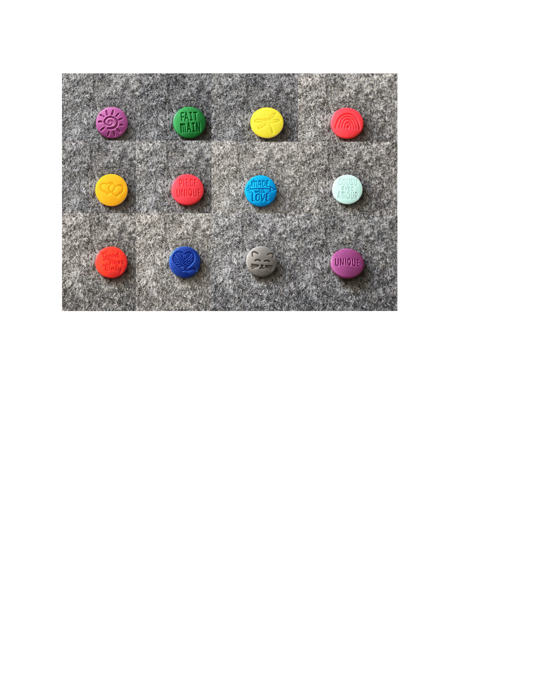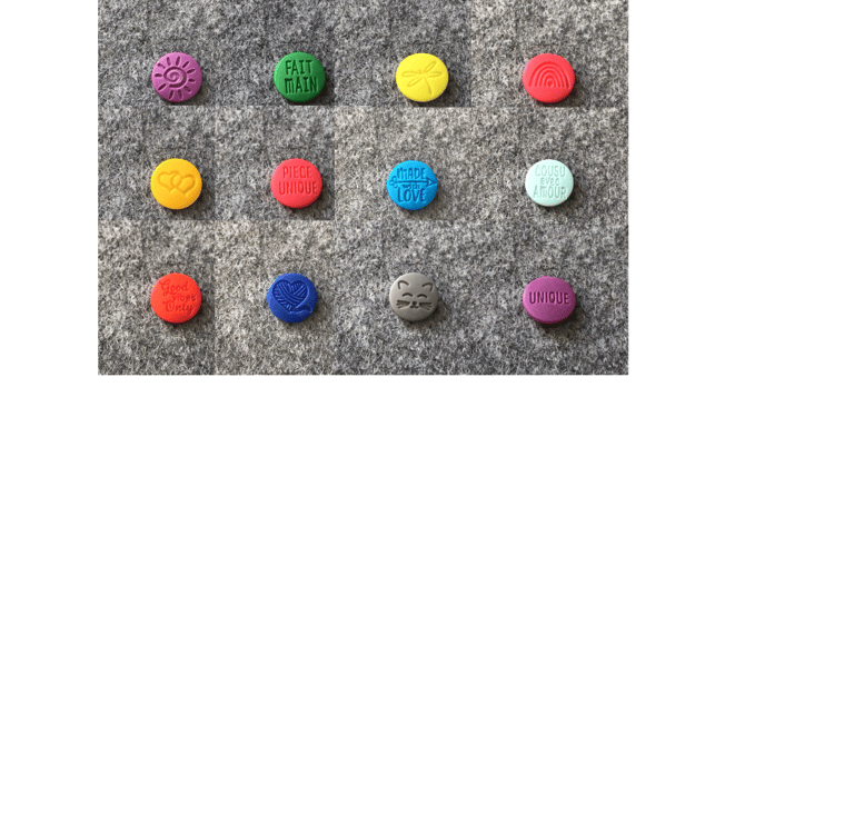 des boutons entiers avec un cabochon gravé, une pièce mâle, une pièce femelle et un cabochon non gravé