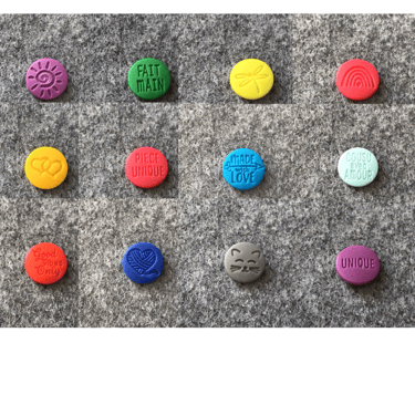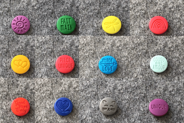 des boutons entiers avec un cabochon gravé, une pièce mâle, une pièce femelle et un cabochon non gravé